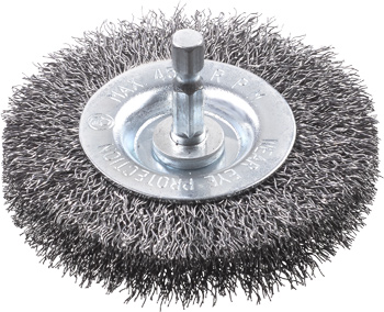 Die kwb Scheibenbürste mit doppeldickem, gewelltem HSS-Stahldraht in 0,3 mm Stärke sorgt für eine hohe Abtragsleistung und lange Haltbarkeit beim Entrosten, Reinigen und Entgraten sowie zur Vorbereitung von Schweiß- und Lötarbeiten. Sie ist entweder mit einem Durchmesser von 75 oder 100 mm verfügbar und entfernt zuverlässig Rost, Farbe, Zunder, Verkrustungen und Grate von Metall, Kanten, Rahmen, Torpfosten, Gittern und Rohren. Auch zur Reinigung von Steinflächen ist sie geeignet. Der E 6.3 Sechskantschaft sorgt für sicheren Halt in gängigen Bohrmaschinen und Akkuschraubern und verhindert ein Durchrutschen. Im Vergleich zu Drahtbürsten für Winkelschleifer reduziert sie den Funkenflug erheblich und erhöht somit die Arbeitssicherheit.