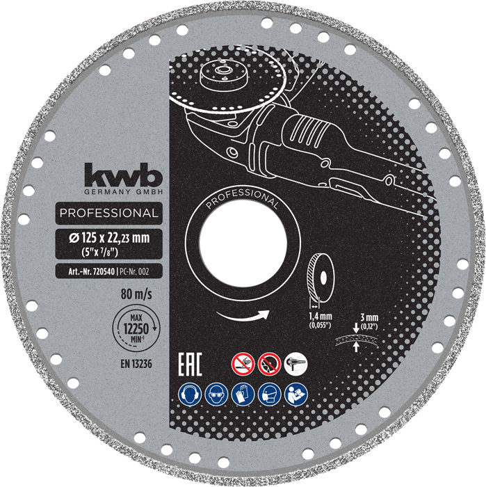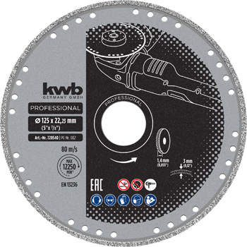 Diamant-Trennscheiben in den Maßen 115 mm x 1,4 mm, 125 mm x 1,4 mm bzw. 230 mm x 2,2 mm. Diamant bestreuter, geschlossener 3 mm Schneidrand bzw. 4 mm bei 230 mm. Für alle Schnitte in Edelstahl, Stahl, NE-Metalle, GFK und PVC. Verwendung der Diamant-Trennscheiben in Winkelschleifern mit einer max. Umfangsgeschwindigkeit von 80 m/s, einer Scheibenaufnahme von 22,23 mm und Spannmutter. Die Diamant-Trennscheiben entsprechen den Sicherheitsanforderungen der EN 13236.