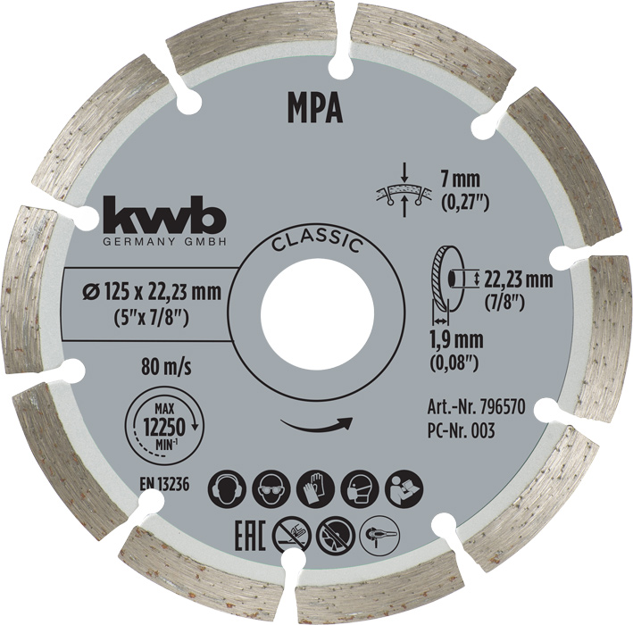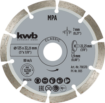Die kwb Diamant-Trennscheibe ist wahlweise in Ø 105 x 1,2 / Ø 115 x 1,2 / Ø 125 x 1,2 / Ø 180 x 1,6 und Ø 230 x 1,6 mm erhältlich und für den Trockenschliff ausgelegt. Durch den diamantbesetzten, segmentierten Schneidrand bietet sie eine hohe Schneidleistung in Hohlblockstein, Mauerwerk und Betonstein. Der Segmentrand verfügt über eine Höhe von 7 mm, die auch präzise und effiziente Schnitte in Beton und Baustellenmaterial erlaubt. Somit bietet sie ein gutes Preis-Leistungs-Verhältnis für den Einsatz im Heimwerkerbereich. Sie eignet sich für den Einsatz auf allen handelsüblichen Winkelschleifern mit 80 m/s Umfangsgeschwindigkeit und ist ideal für Bau- und Renovierungsprojekte.