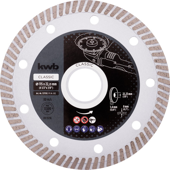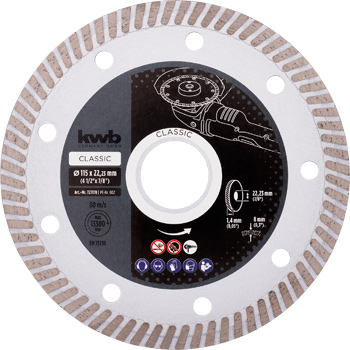 Die kwb Diamant-Trennscheibe mit dünnem, geschlossenem Turbo-Schneidrand, der mit Diamantpigmenten bestückt ist, sorgt für sehr dünne Schnitte in Wandfliesen, Marmor, Bodenfliesen und Feinsteinzeug. Sie ist MPA zertifiziert und durch das Fine-Cut-Design besonders für dünne Granite, Feinsteinzeug, Biberschwanz und glasierte Dachziegel geeignet. Mit einer Segmenthöhe von 7 mm passt sie auf handelsübliche 115-mm- und 125-mm-Winkelschleifern mit einer Umfangsgeschwindigkeit von 80 m/s.