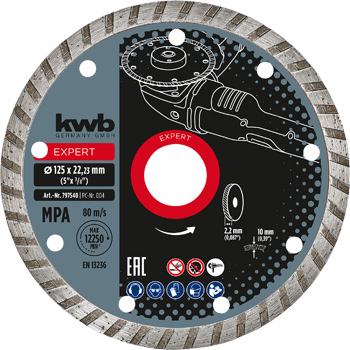 Die kwb Diamant-Trennscheibe mit Turborand, verfügbar in Durchmessern von 115, 125, 230 mm, passt auf alle Winkelschleifer mit 22,23 mm Bohrung. Ihr Turborand, optimiert für Trockenschliffe, garantiert hervorragende Leistungen bei diversen Materialien. Die Schneidrandhöhe von 10 mm und Stärken von 2,2 bzw. 2,8 mm erlauben tiefes Eindringen, während der aus 65 MN Stahl gefertigte Körper mit einer Härte von 85 HRB Langlebigkeit verspricht. DIN EN 13236 konform und MPA-zertifiziert, zeigt sie ihre Stärke besonders bei Marmor, Betondachpfannen und Fliesen, ein Muss für Bau und Renovierung.