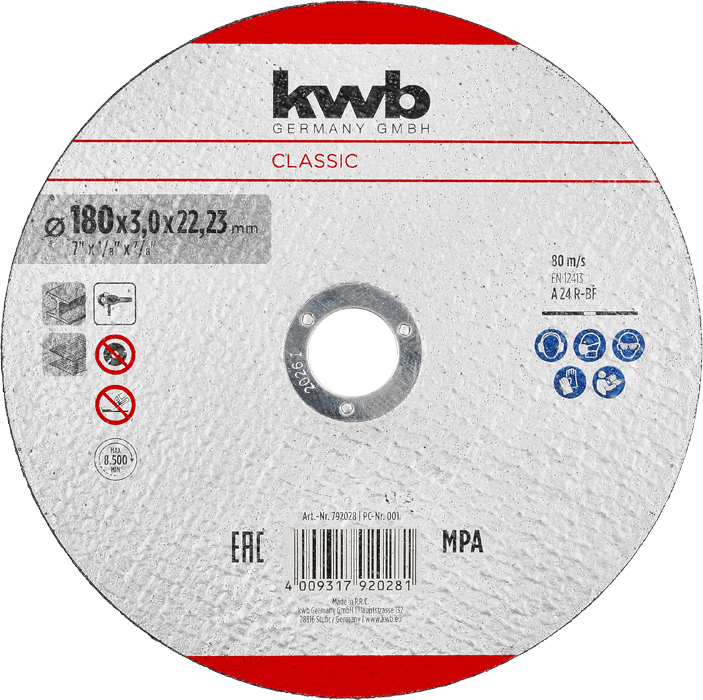 Die kwb Gewebetrennscheibe für Metall aus robustem Aluminiumoxid gewährleistet eine lange Lebensdauer, gute Härte und eine solide Trennleistung. Besonders die gekröpfte Form der Durchmesser 115 / 125 mm schützt die Verschraubung auf der Spindel effektiv vor externen Einflüssen. Dahingegen verfügen die Durchmesser 180 und 230 mm über eine gerade Scheibenform für einen sehr gleichmäßigen, präzisen Schnitt. Die Trennscheibe ist MPA-zertifiziert und als Einzelscheibe oder im Sparpack verfügbar, um individuellen Anforderungen gerecht zu werden. Mit der kwb Schnellspannmutter (Art.-Nr.: 717700) lässt sich die Scheibe schnell fixieren und lösen. Konzipiert wurde sie für gängige Winkelschleifer mit 80 m/s Umfangsgeschwindigkeit.