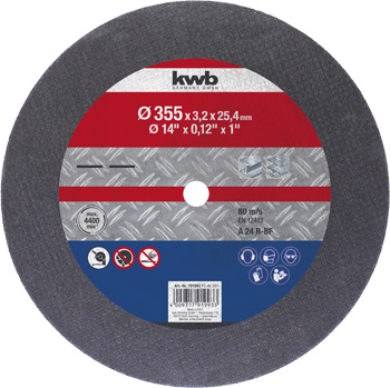 Die gebundene kwb Spezial-Trennscheibe ist mit einer Verstärkungseinlage aus Glasfaser ausgestattet, die für saubere Schnitte in Gusseisen, Stahl, Metallrohren, -profilen, Aluminium, -legierungen, Kupfer, Messing sowie Zink sorgt. Durch den großen Durchmesser von 355 mm ist eine hohe Schnittkapazität möglich. Die Scheibe entspricht den Sicherheitsanforderungen der EN 12413 und ist ideal für Stationärmaschinen mit einer max. Umfangsgeschwindigkeit von 80 m/s und einer Scheibenaufnahme von 25,4 mm.