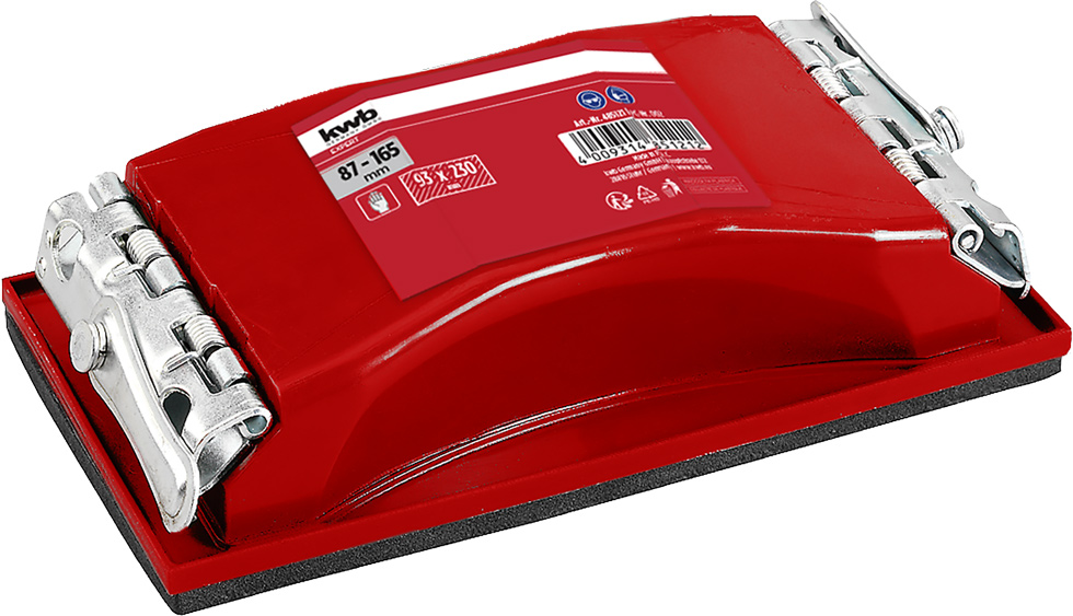 The kwb professional hand sander with spring clamp is characterised by its hard-wearing plastic housing and a sanding plate measuring 163 x 85 mm with a foam rubber coating. It is compatible with 93 × 230 mm sanding strips, making the use of standard sanding strips efficient and cost-effective. The silver spring clamps enable quick sanding paper changes and prevent the sanding strip from slipping. Ergonomically shaped for fatigue-free work, this hand sander guarantees even pressure distribution thanks to the foam rubber coating and minimises the risk of sanding marks.