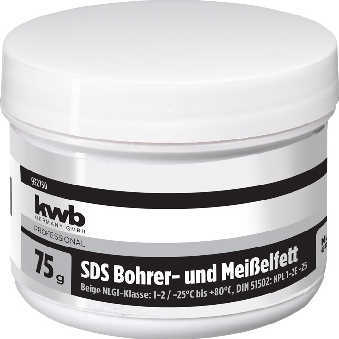 SDS drill and chisel grease is a special lubricant to minimise wear and tear of hammer drills and chipping hammers. Briefly immerge the shaft into the 75g can with the grease before any drilling or chiseling work, then strip it off at the edge of the can and clamp it into the drill and chipping hammer. Check during working and dip it again into the can when the groove at the shaft of the drill or chisel runs dry.